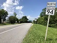 In 1956, MD 94's present termini were established. The state highway was extended from south of Florence to the Patuxent River; the highway was also transferred to county maintenance from Old Frederick Road north to Daniel. MD 94 was relocated to form a four-way intersection with MD 144 when its interchange with I-70 was constructed in 1974.[11] The state highway previously had a short concurrency with MD 144 in Lisbon between the road south to Florence and the highway north to Woodbine; the old alignment remains south of I-70 as Madison Street and north of the Interstate as Old Woodbine Road.[12] The first modern roundabout constructed in Maryland was completed at the intersection of MD 94 and MD 144 in 1993.[13][14] The roundabout with Old Frederick Road at the state highway's northern terminus was built in 1998.[14]