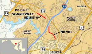 Maryland Route 983 (MD 983) was the unsigned designation for a pair of state highways in the U.S. state of Maryland. The highways formed parts of the old alignment of MD 216 on either side of Interstate 95 (I-95) in North Laurel in southeastern Howard County, Maryland. MD 983 had a length of 1.02 miles (1.64 km) and ran on the east side of I-95. MD 983A spanned 0.71 miles (1.14 km) on the west side of I-95. MD 216 through North Laurel was built in the early 1920s. The segments of MD 983 were designated when MD 216 was relocated east of I-95 in the early 1960s and west of I-95 in the late 1970s. In 2017, both MD 983 and MD 983A were removed from the state highway system and transferred to county maintenance.