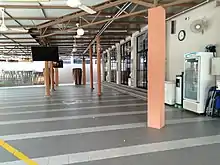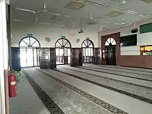 In the prayer hall, a new mimbar (sermon podium) was built into the mihrab (niche area that shows the direction of the qibla'). The simple and bare rectangular prayer hall remains the same which reflects the core function of the mosque which is a place for prayer.[9] From an aerial view, the mosque was built oriented to the direction of the qibla.[10] Other features like a minaret and dome are common for old-style kampung mosques.