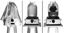 The work consisted of a jar with lard and pork rinds, an electric hot plate and a photo of the first President of Ukraine Leonid Kravchuk placed in lard. When the hot plate was on, lard in the jar melted, becoming transparent and revealing the preserved (mummified) image of the President.[5] Mausoleum for the President was completed before the presidential election. It summarized the "romantic" period of the modern history of Ukraine – acquiring independence. The project proclaimed liberation of Ukrainian people from mental constraints which prevented them from gaining real independence. The topic of mausoleum was a provocation that implied historical parallels and political speculations. The work represented a search for the national recipe of mummification (lard and pork rinds are Ukrainian "totemic accessories").