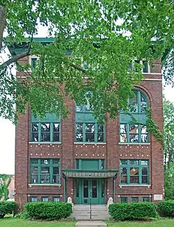 The Masonic Temple is a five-story dark red brick building with grey stone trim. It measures ninety-five feet by forty-three feet. The building occupies a corner lot. The front facade is divided into three window bays, containing tripartite windows, separated by brick piers. The facade along the side street is similarly divided into six bays, five of which contain windows. Windows in the basement level are double-hung, six-over-six, sash window units set in triples. Windows on the first floor are tripled double-hung sash units topped with a transom of eight or twelve lights. The center bay of the main facade contains the entrance, reached by a series of six steps and covered with a steel-and-glass canopy added in 1925-26. The second and third floors contain large arched window units spanning both floors; set into the arches are tripartite widow clusters similar to those on the first floor. The attic contains a four-part bank of vertical windows is framed by a raised brick course in each bay. A galvanized cornice and slightly hipped roof is located above.[2]