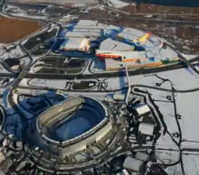 The Super Bowl is considered a top-level National Special Security Event. New Jersey State Police and the NFL host committee installed a 2.5 miles (4.0 km) chain-link perimeter fence around the Meadowlands Sports Complex. The area was in "lock-down" for a week prior to the game.[55] All vehicles entering and leaving are scanned, a precaution through game day.[56] The area was patrolled on land, by air, and by water since it is surrounded by wetlands. More than 3,000 security guards and 700 police officers were scheduled for duty on game day.[57] The sports complex is located at the intersection of number of highways. Security planners planned to strictly limit and regulate access to the area. Event parking spaces were greatly reduced to 13,000 with a cost of $150 each,[13] tailgate parties restricted, and walking to the venue was strictly prohibited.[11][26]