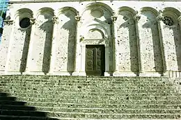The central portal flanked by two lion columns has five panels dating from the early 13th century illustrating the legend of Saint Cerbonius. The three central columns of the tympanum rest on three figures: a bearded man, a griffin and a horse.