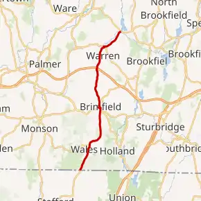 Route 19 in Massachusetts begins when Route 19 in Connecticut crosses from Stafford, Connecticut, into Wales, Massachusetts. The highway meanders through the town and continues north into Brimfield, where it crosses U.S. Route 20 in the center of town. Route 19 continues north out of the town and heads due north, eventually crossing into the town of Warren in Worcester County. Just after crossing into Warren, Route 19 passes underneath the Massachusetts Turnpike (I-90) without an interchange. (The nearest interchanges are at Exit 8 in Palmer and Exit 9 in Sturbridge, both accessible from US-20.) Route 19 heads into the center of town where it meets Route 67. Route 19 joins Route 67 northbound, and the two routes run concurrently northeast until crossing into West Brookfield, where they intersect with Route 9. Route 19 ends here, with Route 67 turning to join Route 9 eastbound.