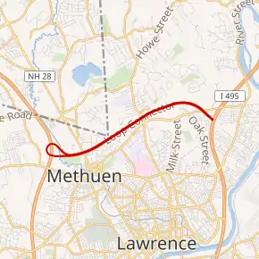 Route 213 is a 3.56-mile-long (5.73 km) state highway in Massachusetts. It connects Interstate 93 (I-93) with I-495 in Methuen, Massachusetts, just south of the New Hampshire border. It is a four-lane, controlled access highway along its entire length. The highway is a northern bypass of Route 113, which serves the downtown area, and derives its own number from it.