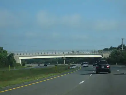 From 1969 until 1987, the eastern terminus of Route 25 was at a junction with Maple Springs Road, US 6 and Route 28 in Wareham near the modern location of Exit 2. The MassDPW and the Massachusetts Highway Department (MassHighway) had plans to extend the freeway eastward to Cape Cod as early as 1953, when the route was included in the proposed Cape Cod Expressway that would connect New York City with Cape Cod.[6] Route 25 was originally planned to connect to the Sagamore Bridge, which carried US 6 over the Cape Cod Canal and was used to access the towns of Hyannis and Provincetown. In 1962, however, the MassDPW conducted traffic studies on the two bridges crossing the canal and found that the Sagamore Bridge was above vehicular capacity, whereas the more southern Bourne Bridge had excess capacity.[6] The Route 25 freeway was then redesigned to cross over the Bourne Bridge and connect with the Mid-Cape Highway (US 6) on the southern side of the canal via the proposed Southside Connector.[6] The connector would have been constructed through the Massachusetts Military Reservation in Bourne, but was canceled by the MassDPW and MassHighway in 1977 when environmental tests indicated the freeway would disturb underground aquifers serving as water sources for the region. MassDPW instead changed the proposed eastern terminus of the Route 25 expressway to the approach ramps of the Bourne Bridge.[7][8]