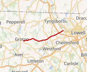 Route 40 is a 10.46-mile-long (16.83 km) east–west state route located in northeastern Massachusetts, entirely within Middlesex County. The short highway connects Groton and Chelmsford. Its western end is at an intersection with Massachusetts Route 119 and Massachusetts Route 225 in Groton, and its eastern end is at Route 3A in North Chelmsford. The route has existed since the late 1940s.