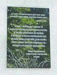 The Massacre in the Mokotów prison - mass murder of residents of the Mokotów prison in Warsaw by the Germans on the second day of the Warsaw Uprising. On August 2, 1944, soldiers of the Waffen-SS - SS-Pz. Gren. Ausb.-und Ers. Btl. 3 (of SS-Panzer Division "Totenkopf") shot about 600 Poles on the premises of the prison at 37 Rakowiecka Street. It was one of the biggest crimes committed by the Germans in Mokotów during the suppression of the Warsaw Uprising. During the massacre, some prisoners actively resisted the Nazis, which allowed several hundred people to escape to the area controlled by the insurgents.