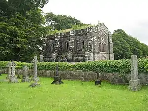 The old Monzievaird parish church was demolished, and nothing remains. On the site the Ochtertyre family built their Mausoleum in 1809; When the foundations of the present mausoleum were being dug a quantity of charred wood was found, and very many calcined bones[8]