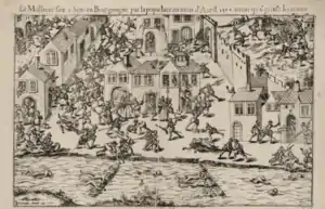The notables put their plan into action on 12 April, taking advantage of the increase in support from rural pilgrims in the town for the feast of Saint Savinien. In the early hours the mayor ordered the people to tear down the Huguenot church. This accomplished, later in the day after the feast, he ordered the militia to arrest the Protestant leadership of the town, catching them off guard with their Gascon captain Mombaut out of the city for the afternoon.[13] The arrests were incompetently carried out, but when Mombaut returned he gathered the Huguenots together in a fortified house and prepared a defence. The Catholics brought artillery to bear on the house, and in the ensuing hours Mombaut and those with him were killed.[14] The mayor and the militia lost control of the proceedings and a general massacre of the town's Huguenot population ensued, the rural pilgrims from out of town setting themselves upon the burghers, with over 50 houses looted and 100 killed.[15] The authorities sought in vain to re-establish control on 13 April but their orders were ignored.[16] The bodies were thrown into the Yonne, a tributary of the Seine, and several days later Pierre Paschal would report seeing bodies in the river near Paris.[17]