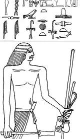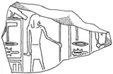 Relief "Cairo Museum CG 1426" is well-preserved. It shows Hesy-re sitting at an offering table. All other panels show him standing opposite it (at least in the well preserved ones). In this panel, he wears a long tight garment, which covers his left shoulder but leaves the right one free. On the left shoulder is some kind of knot. The garment reaches down to his ankles. In his left hand, Hesy-re holds two rods. Scribal utensils hand from his right shoulder. These consist of an inkpot with two holes for red and black paint, a reed writing stick and a bag. Hesy-re's right arm is extended toward the offering table. The offering table reaches up to his left. On the actual offering plate are eight loaves of bread. Directly above the table is a short offering list, including wine, incense, cool water, beef(?) meat and antelope meat. In the upper part of the relief is a full list of Hesy-re's titles: Chief dentist,[6] Heka Priest of Mehyt, Elder of Qed-hetep,[7] He who sees Min,[8] Acquaintance of the King, Overseer of the Craftsmen of the King, Great one of the Headscarf (?),[9] Father of Min, Overseer of the Cult Building of Mehyt, Great one of Buto,[10] Foremost of the Couriers (?),[11] Great One of the Ten of Upper Egypt, Priest of Horus of the Harpoon-place of Buto (?).[12]