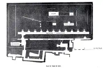 Near the west end of the mastaba, an isolated vertical shaft sinks 21 metres down to the underground grave chambers. These are oriented to the south and divided into three levels. The top level contains two main passages which lead to several rooms and magazines. The west passage divides into two and ends in stairs which descend to the other two levels and lead to unfinished passages. The actual grave chamber had already been plundered when it was discovered.