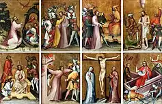 The Master of the Grudziądz Altarpiece was a Bohemian artist,[1] active at the end of the 14th and the beginning of the 15th century. His name is derived from an altarpiece which hung in the castle of the Teutonic Knights in Grudziądz (German: Graudenz), and may now be seen in National Museum in Warsaw.[2] Closed, the altarpiece depicts the Noli me tangere and the resurrection of the dead on two registers to the left; on the right, Christ in Majesty and the Virgin and John the Apostle. The wings show eight scenes from the Passion, while inside are scenes from the Life of the Virgin. At the center is an image of the Death and Coronation of the Virgin.