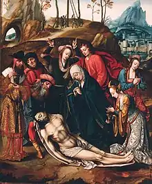 These figures were usually depicted in agitated poses amidst architectural ruins.[7] The earlier works included Gothic architecture but in later works Renaissance structures became prevalent.[7] The paintings appear to combine Early Netherlandish and Northern Renaissance styles, and incorporate both Flemish and Italian traditions into the same compositions.[8] Most of the artists of Antwerp Mannerism have remained anonymous and only some of the artists have been identified.[6] They include Jan de Beer, Adriaen van Overbeke and the Master of 1518 (possibly Jan Mertens or Jan van Dornicke).[8]