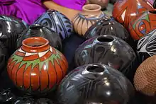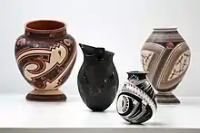 Emphasis is generally on quality rather than quantity, differing from pottery production in central Mexico.[1] Most pottery that is produced is of lesser quality with thicker walls and less-artistic painting. There is a middle group that makes good quality and an elite number who can make truly artistic wares. These top artists include members of Quezada's family (Lydia, Nicolas, Noe, and Damian Quezada), the Ortiz family (Felix, Nicolas, and Macario), Taurina Baca, and Hector and Graciella Gallegos, among others. Nicolas Ortiz, best known for creating sculptural pieces.[4] From the last category come some of the best handmade pottery in the world.[7]