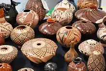 After painting, the pots are fired on open ground or in pit ovens. Two or three small pots may be fired together, but larger ones are fired individually. They are set on a pile of dried cow dung and wood and if fired on open ground, covered with a large overturned pot called a “saggar.”[4][6] For polychrome pots, air is allowed to circulate inside the firing chamber. If the pots are to be turned black, the chamber is sealed to keep smoke in and air out. Lydia Quezada is credited for the black variation. She says she learned how to do it when she accidentally sealed the chamber for a polychrome pot, creating black clouds. The effect prompted her to experiment.[4]
