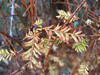 Unlike the related miro (Prumnopitys ferruginea), mataī has a distinctive and long-lasting juvenile stage. The juvenile is a shrub with a tangle of slender, flexible, divaricating branchlets interspersed with a scattering of brown, pale yellow, or dirty white leaves. After a number of years, the adult tree begins to grow out of the top of the juvenile shrub and then the divaricating branchlets will wither and drop off.[3][4]