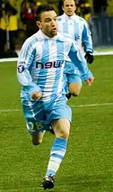 Mathieu Valbuena (born 28 September 1984) is a French professional footballer who plays for Greek Super League club Olympiacos. He plays as an attacking midfielder and a winger and is known for his pace, technical ability, and tenacious style of play.[4] He is described by his former coach at Libourne Saint-Seurin Didier Tholot as "an explosive player who is capable of quickly taking two opponents out of the game to create space, above all due to his dribbling skills."[5] Due to his small stature, Valbuena is nicknamed le petit vélo, which translates to "the little bike".[6]