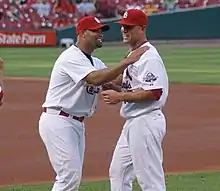On July 24, 2009, the A's traded Holliday to the St. Louis Cardinals for prospects Brett Wallace, Clayton Mortensen, Shane Peterson[103] and $1.5 million.[104] He represented an instant offensive upgrade for Cardinals left fielders, who had batted .212 with a .294 on-base percentage and a .342 slugging percentage in 2009,[105] and for cleanup hitters, who had batted .250 with .325 on-base percentage and .443 slugging percentage. He hit in the fourth slot in the lineup behind All-Star first baseman Albert Pujols.[106] Because Pujols already wore jersey number 5, the number Holliday previously wore with Colorado and Oakland, St. Louis issued him the number 15.[105]