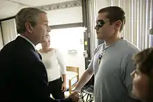 - "President George W. Bush shakes hands with CPL. Matthew James after awarding the Manassas, Va., soldier with a Purple Heart during a visit Friday, July 1, 2005, to Walter Reed Army Medical Center. CPL. James is recovering from injuries received while serving in Operation Iraqi Freedom. White House photo by Eric Draper".