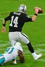 McGloin made the team and began the season 3rd on the depth chart, behind starter Terrelle Pryor and backup Matt Flynn.[19] After Flynn's disappointing Week 4 showing (starting for an injured Pryor) against the Washington Redskins, McGloin was promoted past Flynn to be Pryor's backup.[20][21] McGloin made his first NFL appearance during the fourth quarter of the November 3, 2013 game between the Raiders and the Philadelphia Eagles.[22] He debuted as the Raiders' starting quarterback on November 17, 2013; along with Buffalo Bills quarterback Jeff Tuel, he was one of two undrafted rookie quarterbacks to start a game in the 2013 season, a historically rare occurrence. McGloin threw for three touchdowns and led the Raiders to a 28-23 victory over the Houston Texans. The next week, McGloin threw a go-ahead touchdown to Marcel Reece late in the fourth quarter of a 23-19 loss to the Tennessee Titans. In a Thanksgiving contest against the Dallas Cowboys, McGloin earned praise for his play in the loss and an honorable mention for Phil Simms's "All-Iron Award" for the most valuable player. Despite consistent play from McGloin, the Raiders lost their next four games, and Pryor retook the starting role for the final game of the season. McGloin's 259.0 passing yards per game is second only to Jake Delhomme in NFL history for an undrafted rookie.
