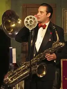 Tolentino's fascination with jazz-age music began at age 8, when a neighbor gave him a cassette tape recording of the Coffee Club Orchestra (as featured on radio's A Prairie Home Companion).[2] He began his musical venture at 11, when he picked up the clarinet to play in the band at Stonewall Jackson Elementary. He played clarinet exclusively until he entered his sophomore year of high school, when he branched out and added saxophone, tuba and accordion. By age 16, his devotion to music was such that he asked his parents to help him buy a used accordion instead of a used car.[3] Much of high school was spent playing polka gigs in restaurants and playing with the school jazz band. He graduated from Woodrow Wilson High School in 2003.[4] A musical autodidact, Tolentino sings lead vocals and plays many instruments, including accordion, clarinet, tuba, bass saxophone, ukulele, banjo, piano, and vibraphone.[5]