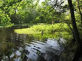 Wildlife found on the property include a number of game animals, such as deer, bear, turkey, and squirrels; waterfowl are also abundant within the area's wetlands.[6][7] Other game bird species, such as bobwhite quail and woodcock, are also found at the property and benefit from management that periodically clears portions of the landscape of mature vegetation.[2] Fish found within the river include bluegill, redbreast sunfish, and largemouth bass; ponds on the property contain crappie, bluegill, largemouth bass, chain pickerel, and a limited number of bowfin.[6]