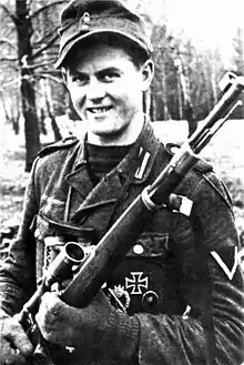 Matthäus Hetzenauer (German pronunciation: [maˈtɛːʊs ˈhɛtsənaʊ̯ɐ], 23 December 1924 – 3 October 2004) was an Austrian sniper in the Wehrmacht of Nazi Germany during World War II. He served in the 3rd Mountain Division on the Eastern Front of World War II, and was credited with 345 kills. His longest confirmed kill was reported at 1,100 meters (1,200 yards).[1] Hetzenauer received the Knight's Cross of the Iron Cross on 17 April 1944.[2]
