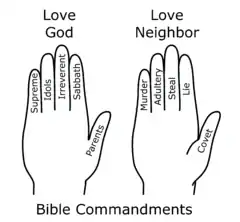 ![]() Ten Commandments distilled down to a word or two each, and then associated with the fingers of the left and right hand as a mnemonic device. | |