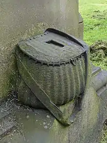 This is a Grade II listed monument, listed for its "finely carved lettering and figures."[41] Matthew Taylor's father William died on 24 May 1873 and was buried in Woodhouse Cemetery four days later.[3] Matthew was the "gifted sculptor" of William's gravestone, known as the "Angler's Tomb".[21] As of 2017, the gravestone has been removed from the right to the left side of the chapel at Woodhouse Cemetery, and the kingfisher is missing from the top of the monument. The illustration of fishing in the Wharfe has weathered, obscuring the face of William Taylor and the view of Grewelthorpe on the far bank. The Reverend William Thomas Adey (1844–1925), who was pastor of Burley Road Baptist Church, Leeds 1870–1878,[42][43] and a friend of Matthew, wrote about this "beautiful and interesting memorial" in 1905 as follows:[21]