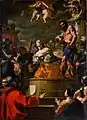 During most of 1653–1660, he worked in Naples, where he was influenced by another prominent painter of his era, Luca Giordano. Preti's major works include a series of large frescoes, ex-votos depicting the Virgin or saints delivering people from the plague, which were painted on seven city gates and are now lost. Two sketches are in the Capodimonte Museum in Naples.[3] The bozzetto of the Virgin with the baby Jesus looming over the dying and their burial parties envisions a Last Judgement presided over by a woman.[4] Preti also won a commission to supervise the construction, carving, and gilding for the nave and transept of San Pietro a Maiella.