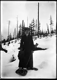 Mattie Gunterman, born Ida Madeline Warner (Spring 1872 – 1945), was a Canadian photographer and mining camp cook in British Columbia. Gunterman started taking photos in the spring of 1897, mainly documenting her family and from that point forward her interest and skill in photography continued to grow. From the years 1899 to 1911, she served as a cook at a mining camp while also creating autobiographical photographs.[1] She received some formal training about the basics of photography while growing up in La Crosse from her photographer uncle.[2] Gunterman often included herself in her photographs creating a personal narrative of pioneer life in Canada and representing herself as a self-sufficient and confident leader. She contributed a notable historical record of the early 1900s mining boom in Lardeau, a former mining region located in the Kootenays region of British Columbia. In 1927, the Gunterman's home in Beaton was destroyed by a fire therefore much of her work was lost. The only existing work of Gunterman's are three photograph albums that currently belong to her grandson, Avery Gunterman and three hundred glass plate negatives that are part of the Vancouver Public Library collection.[3] An exhibition of her work alongside Emily Carr’s was on display at the Vancouver Art Gallery from May 5 to September 3, 2018.[4]