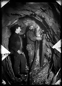 Gunterman mainly took photographs from 1897 to 1911. Her photographs were mainly taken in areas surrounding Beaton and the Arrow Lakes District of British Columbia as well as in the Pacific Northwest and California during her travels there in 1905.[5] Typically during the winter months Gunterman would develop her glass plate negatives and turn them into prints.[6] Initially, her primary purpose for taking photographs was to record her life, family and surroundings for her son Henry. She created her own autobiographical narrative through her photographs. In order to create self-portraits and to include herself in group photos, Gunterman would use a piece of rubber tubing attached to the camera's inflatable shutter at one end and a rubber bulb at the other to take the picture.[2] The first camera that she used was a Bull's Eye snapshot camera.[6] Her works at the start mainly consisted of posed group photos. She then purchased a No.5 Cartridge Kodak 4 x 5 plate camera in 1898 as it allowed for more versatility when playing with exposure, focusing and shutter speed.[5] In 1902 Gunterman became the chef at the Nettie-L mine in the Lardeau region and at each long work shift she brought along her camera.[2] She captured everyday life at the mine such as scenic views of the Lardeau region, men working hard in the mine and her fellow kitchen co-workers. Her photographs expose the gruelling work at the mine but also focus on more lighthearted aspects such as games they would play. Mining operations such as the Nettie-L and other surrounding mines totally ceased by 1905. However within the Kootenays logging activity increased and became another subject for Gunterman to photograph. Her work is essential for understanding life during the mining boom in the early 1900s. Furthermore, her photographs of both mining and logging activity are fundamental for understanding the jobs that drove the Canadian economy during the turn of the century. Gunterman's work is also some of the only photographic evidence of these mining towns when they were flourishing. In present-day these towns do not exist therefore her photographs serve to remember this region when it was prosperous and thriving.