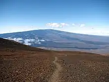 The Mauna Kea Trail, also known as the Humuʻula Trail,[1] is a hiking route leading from the Onizuka Center for International Astronomy to the summit of Mauna Kea, the highest volcano on the island of Hawaiʻi. The trail is a 6 mi (10 km) long, unmaintained dirt and scree path with two short road sections, about 600 ft (180 m) at the beginning and about 1 mi (1.6 km) near the summit.[2] Cairns and reflective posts mark the route above 10,000 ft (3,000 m).[1]