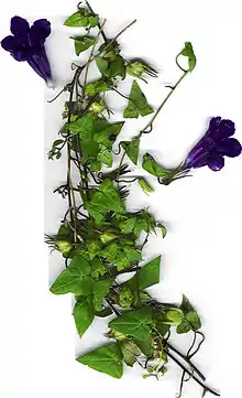 Maurandya barclayana (syn. Asarina barclayana; orth. var. M. barclaiana), commonly called angels trumpet[1] or Mexican viper,[2] is an ornamental plant in the family Plantaginaceae native to Mexico. Growing to 4 m (13 ft) in height, this herbaceous perennial climber has ivy-like leaves and white, pink or purple tubular flowers. As it does not tolerate being frozen, in temperate climates it is often grown under glass in a conservatory, or alternatively as a tender annual. It requires a sheltered position in full sun. It has gained the Royal Horticultural Society's Award of Garden Merit. [1]