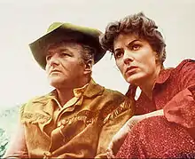 In the 1950 Technicolor Western, Comanche Territory, O'Hara played an unusual role as the lead character of Katie Howards, a fiery saloon owner who dresses, behaves, and fights like a man, with hair tied back.[117] She "mastered the American bullwhip" during the filming, [114] in a role which Crowther believed was "more significant than a setting sun" in that she "tackles her assignment with so much relish that the rest of the cast, even the Indians, are completely subdued."[118] She received first billing above co-star Macdonald Carey.[119] O'Hara then appeared as Countess D'Arneau opposite John Payne in Tripoli, directed by O'Hara's second husband, William Houston Price.[120] She was next cast by John Ford in the Western Rio Grande, the final installment of his cavalry trilogy. It was the first of five films to be made over 22 years with John Wayne, including The Quiet Man (1952), The Wings of Eagles (1957), McLintock! (1963), and Big Jake (1971), the first three of which were directed by Ford.[121] O'Hara declared that "from our very first scenes together, working with John Wayne was comfortable for me".[122] Her chemistry with Wayne was so powerful that over the years many people assumed that they were married, and newspapers occasionally published sensationalist stories from people claiming to be their love child.[123] In April 1951, she received a call from Universal Pictures that she was cast as a Tunisian princess named Tanya in the swashbuckler film, Flame of Araby (1951).[124][125] O'Hara "despised" the film and everything it stood for,[126] but had no choice but to make the film or be suspended. By that time, she began to grow tired of the roles she was offered and wanted to perform roles that had more depth than the ones she had done thus far.[127]