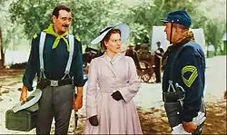 O'Hara instead starred in the Technicolor war picture, To the Shores of Tripoli, her first Technicolor picture and first on-screen partnership with John Payne, in which she portrayed Navy nurse Lieutenant Mary Carter.[63] Though the film was a considerable commercial success, becoming a benchmark for "service pictures" of the era, O'Hara later commented that she "couldn't understand why the quality of his (Bruce Humberstone's) pictures never seemed to match their impressive box-office receipts".[63] Malone wrote that "nobody in the film seemed to have lived life. The character's emotions, like their uniforms, seem too streamlined".[64]