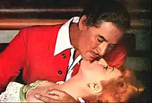 O'Hara next played an unconventional role as a timid socialite who joins the army as a cook in Henry Hathaway's Ten Gentlemen from West Point (1942), which tells the fictional story of the first class of the United States Military Academy in the early 19th century. The film was disagreeable to O'Hara because Payne dropped out and was replaced by George Montgomery, whom she found "positively loathsome".[65] Montgomery attempted to make a pass at her during the production, prolonging his kiss with her after the director had yelled "cut".[66] Later that year, O'Hara starred opposite Tyrone Power, Laird Cregar and Anthony Quinn in Henry King's swashbuckler The Black Swan. O'Hara recalled that it was "everything you could want in a lavish pirate picture: a magnificent ship with thundering cannons; a dashing hero battling menacing villains ... sword fights; fabulous costumes ...". She found it exhilarating working with Power, who was renowned for his "wicked sense of humor".[67] O'Hara grew very concerned about one scene in the picture in which she is thrown overboard in her underwear by Power, and sent a warning letter home to Ireland in advance.[68] She refused to take her wedding ring off in one scene which resulted in screen adjustments to make it look like a dinner ring.[69] Though the film was praised by critics and is seen as one of the period's most enjoyable adventure films, the critic from The New York Times thought O'Hara's character lacked depth, commenting that "Maureen O'Hara is brunette and beautiful—which is all the part requires".[70]