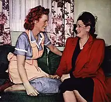 In 1945, O'Hara starred opposite Paul Henreid in The Spanish Main as feisty noblewoman Contessa Francesca, the daughter of a Mexican viceroy.[84] O'Hara described it as "one of my more decorative roles",[85] as her character is a particularly aggressive one among the men on a ship, and during the course of the film her face is smothered in chimney soot.[86] O'Hara almost did not win the role when another actress falsely told RKO executive Joe Nolan that she was "as big as a horse" after giving birth to a daughter in 1944.[87] Around this time "an actress named Kathryn" also falsely accused O'Hara of making sexual advances towards her in an elevator, which she believed was a way for the actress to gain attention at the start of her career.[88] During the production of The Spanish Main, O'Hara was visited by John Ford, who was initially turned away for being shabbily dressed, but was later admitted to informing her about the project that would become The Quiet Man (1952). Malone notes that in the film O'Hara "shows her determination not to leave her sexuality at the birthing stool", commenting that she looks "deliciously fragrant in the splashy histrionics on view here, in RKO's first film in the three-color Technicolor process" [87] O'Hara became a naturalized citizen of the United States on 24 January 1946,[6] and held dual citizenship with the United States and her native Ireland.[89]