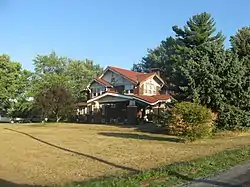 Maurice W. Manche Farmstead is a historic home and farm and national historic district located in Ripley Township, Rush County, Indiana. The farmhouse was built in 1919, and is large two-story, Bungalow / American Craftsman style dwelling faced in brown brick, stucco and half-timbering. It has a low pitched roof with red ceramic tile features a connected long porte cochere and porch. Also on the property are the contributing gambrel roofed livestock barn, corn crib, windmill, scale shed, and fence.[2]: 5