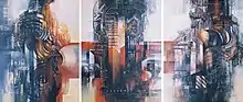 His works, like that of his brother Antonio, tend to deal with urban themes often about human decadence. Images are not realistic and generally distorted. Mauricio’s works often contain urban landscapes with a chaotic feel. The Aus der Tiefe series deals with the violence in human society, which Mauricio has said continues to grow. Maurico considers his works to be cathartic, especially for him as he paints.[4]) He states that his main influences are Francisco Goya, Francis Bacon and Giovanni Battista Piranesi as well as German Expressionism, and Goya’s Black Paintings. He mostly uses acrylics because they dry faster than oils.[3] According to art critic Carlos Blas Galindo, García Vega’s works are meant to disquiet, move, impact, impress, surprise and amaze onlookers. His images can evoke a sense of terror, the sublime, the sinister, the grotesque, the brutal and the dramatic. His works are often done in diptychs and triptychs.[2]