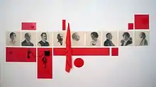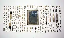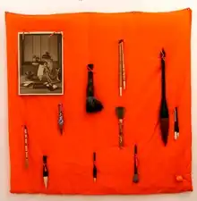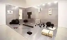Maurizio Pellegrin began showing his work in the early 1980s. By the middle of the decade, he was creating installations with his structured and organized system of objects and their symbolic associations. He arranged found objects that he had gathered during his travels around the world, channeling his passion and knowledge of antiquities through his work.[13] Pellegrin has always been interested in the way objects transmit energy and how the memory of their use endures. He sees objects as the testimony of human life and artifacts of memory, as well as the remains of life after death. He ascribes meaning to his work based on the science of Numerology,[14][15][16] or the study of numbers and their influence on human life based on their symbolic and arithmetic values. His installations deal with the concept of space– both physically and philosophically– becoming universes organized by symbols and metaphors. The arrangements of objects and materials develop a new hierarchy in which their previous functions are drastically changed.[11] Step by step, the capacity of communication and the inner power of the different elements (often wrapped by the artist to contain the energy) establish a new world of relations.[17] Colors, which are always few, are then chosen for specific philosophical implications and psychological effects.[18] Pellegrin's wall arrangements and installations are characterized by a somber beauty, personal and historical references. The incorporation of mostly black and white photography in Pellegrin’s work, along with video, began in the 1990s and continues to play an important role today.[19]