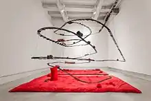 Maurizio Pellegrin at the age of 26, in 1982, started showing at the international Galleria Il Capricorno[20] in Venice, Italy where he had the chance to meet artists such as Keith Haring, James Brown and Donald Baechler.[21] In the late 80s he moved to Rome[1] where his rigorously structured wall installations became widely known in Italy thanks to multiple exhibitions at Galleria Valentina Moncada,[22] Paolo Vitolo,[23] and Il Ponte Contemporanea.[24] Pellegrin's career made an advance[1] in 1988 when he was invited by Giovanni Carandente to participate to the XLIII Venice Biennale.[25] This occasion lead him to have solo exhibitions in important American museums such as the San Diego Museum of Contemporary Art, San Diego in 1990 (exhibition curated by Lynda Forsha),[26] The Corcoran Gallery of Art (exhibition curated by Terrie Sultan), Washington D.C in 1992,[27] and The Museum of Modern Art (MoMA) (exhibition curated by Fereshteh Daftari), New York in 1993.[28] His trips to the United States intensified[1] because along with the museum exhibitions, arrived the possibility of working with Jack Shainman Gallery (1990–95) and Tony Shafrazi Gallery in New York,[29] and Feigen Incorporated in Chicago.[30] In the 1990s Pellegrin divided his time between New York and Venice.[1] In New York for John Gibson Gallery [31] and Esso Gallery,[32] in L.A. for Mark Moore Gallery,[33] in Venice, Italy for Nuova Icona,[34] and in Cleveland for the Cleveland Center for Contemporary Art[35] among others, Pellegrin conceived a cycle of site-specific works which involved the entire space of the gallery, sometimes covering the walls with monochromatic quilts or metal sheets, recreating unexpected atmospheres animated by objects and recurring motifs. Pellegrin further developed his interest for the challenges given by the space, pre-existing energies, and history creating site-specific works also in historical museums, churches, palaces, and gardens throughout the world.[1] The images of many of these site-specific works are collected in the books Maurizio Pellegrin - Reflection and Intention (1999)[36] and Maurizio Pellegrin by Alice Rubbini (2005).[37] In the meantime Pellegrin exhibited in Germany in a few galleries among which Andreas Binder[38] and Galerie Thomas in Munich,[39] and Galerie Beck & Eggeling in Leipzig.[40] From 1995 to 2002 Pellegrin worked with Lisa Sette Gallery in Scottsdale, creating installations focused on black and white photography, one the leitmotiv of his work.[19] In 2005 his hometown, Venice, celebrated Pellegrin in eight museums simultaneously. The project called Isole was organized on a series of site specific exhibitions, in the Doge's Palace, Museo Correr, Museo di Palazzo Mocenigo, Ca' Rezzonico, Galleria Internazionale d’Arte Moderna (Venezia) Ca' Pesaro, Stanze Monumentali della Biblioteca Nazionale Marciana, and others.[41][42] Isole reveals the influences that have informed Pellegrin’s work including photography and cinema, poetry and literature, architecture, and music. The following year, in 2006, the Peggy Guggenheim Collection in Venice opened its doors to Pellegrin who, for the occasion, presented a selection of video installations in an exhibition called It’s a Jungle out There: the Illegal Maurizio Pellegrin, 12 films.[43] In Italy, Pellegrin has exhibited in other galleries among whom Studio Giangaleazzo Visconti, Milan;[44] Studio Tommaseo – Trieste Contemporanea, Trieste;[45] and Marignana Arte, Venice where in 2015 he showed Flying Trains, a large suspended installation where delicate curves of seemingly weightless railways generate a soft centrifugal force.[46]