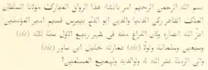 | 692 AH (1292 CE) | ![]() | Base of doorway and under the lintel | "In the name of the merciful and compassionate God. Began to build this blessed sanctuary (meshhed) of Abu Horeira, may God receive him, companion of the apostle of God, on whom be prayers and salvation, our Lord and our master the very great, learned, and just Sultan, resolute champion and guardian (of Islam), victorious, El-Malek el-Achraf, prosperity of the world and of religion, Sultan of Islam and of the Mussulmans, lord of Kings and Sultans, Abu'l-Feda Khalil, co-sharer with the Emir of the Believers, may God exalt his victory, son of our master the Sultan, hero of the holy war, El-Malek El-Mansur Kelaun es-Salehy, may God water his reign with the rain of his mercy and his grace and the benefits of his indulgence, may he make him to dwell in the gardens of Eternity, may he come to his aid on the day of resurrection, may he make him a place under a wide shade with abundant water and quantities of fruit without stint, may he grant him the reward and the delights he has deserved, may he raise his places and degrees into the..." "Amen ! The building of it was finished in the months of the year 692, and there was entrusted with its building Aydemir the dewadar ("bearer of the inkstand") Ez,-Zeiny (?) may God pardon him, him and his descendants, as also all Mussulmans."[25][16] |