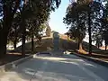 The mausoleum complex is best known for the pyramidal monument which stands in front of the tomb itself, and which is often mistaken for the tomb. Called "Shou Qiu" ("mound or hill of longevity"), this monument marks the birthplace of the Yellow Emperor according to legend. It is unique in China because of its pyramid-shaped stone construction. It consists of a mound that has been covered with stone slabs during the reign of Emperor Huizong of the Song dynasty in 1111 CE.[1] The entire pyramid is 28.5 metres wide and 8.73 meters high. On its flat top stands a small pavilion that houses a statue, variously identified as the Yellow Emperor or Shaohao. The mound and tomb stands inside a compound with many old trees, chiefly thujas planted on the orders of the Qianlong Emperor of the Qing dynasty, who visited the site in 1748.[1]