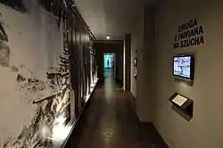 The museum is located on Szucha Avenue, in the building of the prewar Ministry of Religious Beliefs and Public Education (now the Ministry of National Education). After the outbreak of World War II, the Nazis took over the building and turned it into the headquarters of the Sicherheitspolizei and Sicherheitsdienst police forces. The whole street was closed to Poles.[1] In the basement of the building, the Nazis set up rough jails. Prisoners who were located there were usually freshly caught or transferred from Pawiak prison. Prisoners were subject to brutal interrogations, during which they were tortured and severely beaten. Torture was no exception for any prisoner, and even pregnant women were beaten and tortured.[2] Polish prisoners often scratched out some sentences about beatings into the prison walls. Many of these inscriptions were also personal, patriotic or religious. In the 1960s research was conducted, and over 1,000 texts were conserved. The most famous of them is the following:[3]