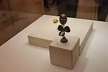 The surprise is a heart shaped photo frame that opened as a three-leaf clover with each leaf containing three miniature portraits of Nicholas II, his wife, the Empress Alexandra Fyodorovna, and their first child, Grand Duchess Olga Nikolaevna. It was made of rose-cut diamonds, strawberry red, green and white enamel, pearls and watercolour on ivory.[1] The surprise is now on display in the Fabergé Museum in Saint Petersburg, Russia.