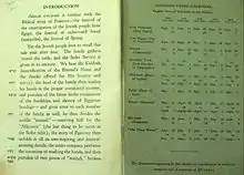 The 1932 edition gave equal prominence to the complete Hebrew text and its English translation, placing them in parallel columns, and conveyed authenticity and adherence to tradition by opening from right to left in the manner of a Hebrew book.[9] Instructions for conducting the Seder appeared on the English side only and references to biblical verses cited in the text were on the Hebrew side.[10] The Haggadah presents only the text and directions for conducting the Seder, without exegesis.[11]