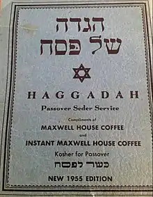 The Maxwell House Haggadah debuted in 1932 as part of a marketing campaign for Maxwell House kosher for Passover coffee by Joseph Jacobs Advertising originally of New York City and currently based in Teaneck, New Jersey.[4][5] Copies were distributed in-store with the purchase of Maxwell House Coffee.[6] While other kosher for Passover food companies – such as Manischewitz and Streit's – also distributed their own Haggadahs, the Maxwell House Haggadah became the best known and most widely used in American Jewish homes. Balin contends that this popularity was due to three factors:[6]