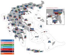 New Democracy won a substantial plurality of 108 seats thanks to Greece's majority bonus, but ND and PASOK were the only pro-bailout parties present and now lacked a majority between them. Conversely, the anti-bailout parties were deeply divided between left and right. ND leader Antonis Samaras,[3] Syriza's Alexis Tsipras,[4] and PASOK's Evangelos Venizelos all tried and failed to put together governments in the days following the election.[5] On 16 May, President Karolos Papoulias appointed Panagiotis Pikrammenos as caretaker Prime Minister and scheduled a new general election for 17 June.[6]